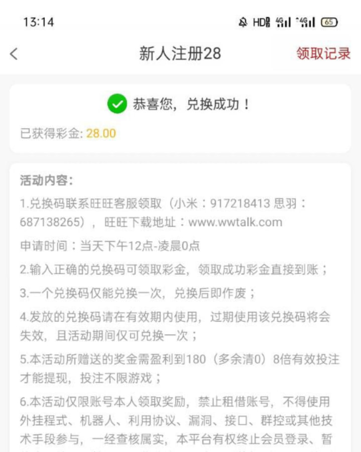 新用户下载APP,完善个人信息,特邀短信送28,优惠里需要添加旺旺领取,自行碰瓷,出款自测!