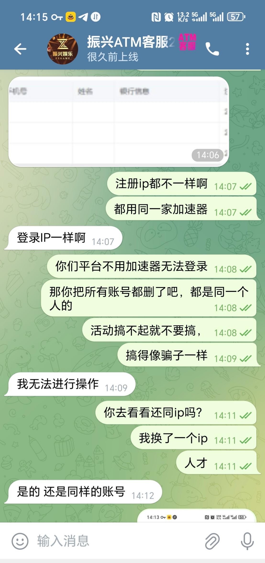 飞机振兴Atm现在狗庄连ip都改看到有说振兴atm飞机抢红包的,中奖了就说我多ip给我截图,我换了个ip,跟我说还是多ip,结果被我实锤,连ip都改,这种狗庄绝对是黑网提不出来的,现在狗庄真行,把你的ip改成和别人一样的,注册ip全部不一样,他把登录ip改成一样的,为了骗人进群狗庄真是费尽心思