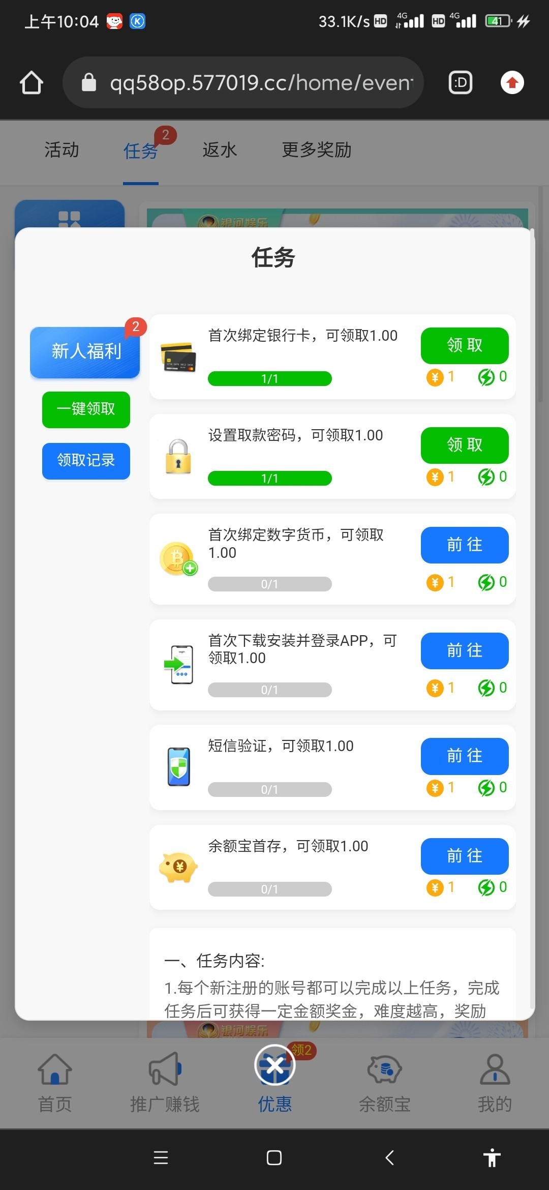 新用户注册绑卡,首页五个任务窗口,领5取元,满10元提现