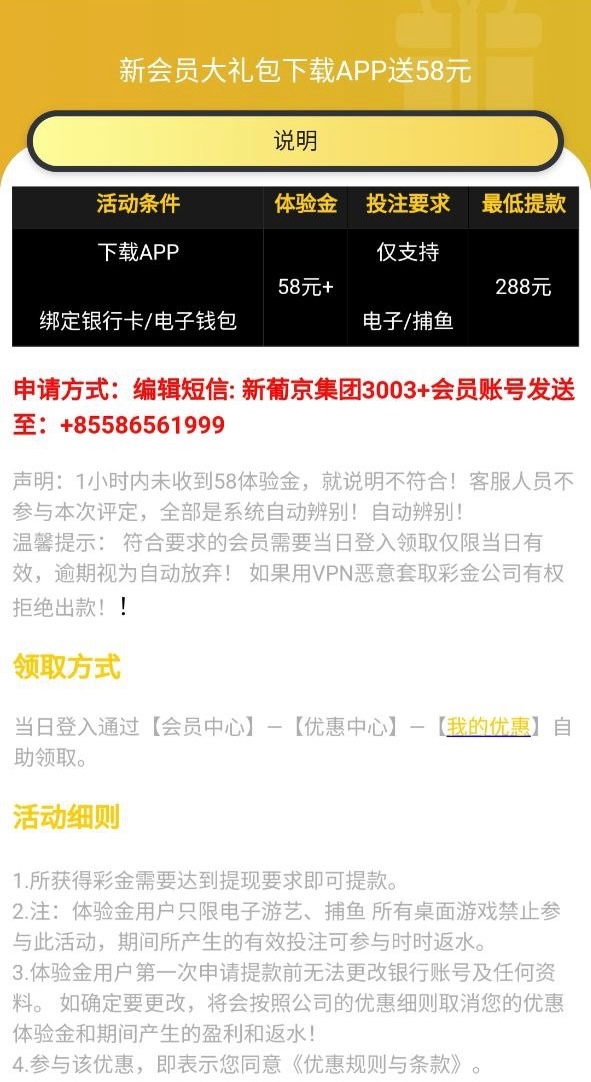 新用户注册绑定信息看活动要求发送短信申请58彩金(一小时没到不符合,这个之前发短信送19,没玩过的去吧。
