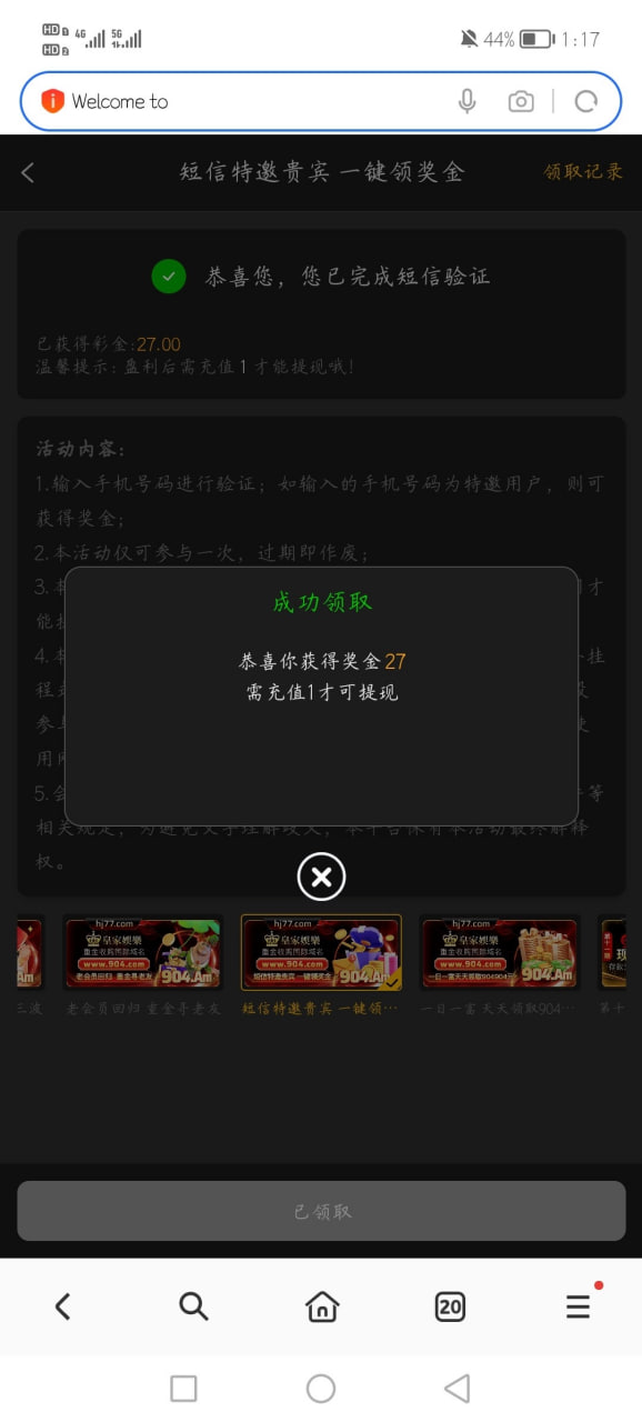 短信特邀碰瓷,注册账号绑定常用手机号码,自助申请活动彩金,出款需要最低存款1块钱,打出来可以自己存10块试试,出款自测!
